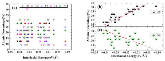 Firstly, the surface energy of Al (001) is computed to be 0.058 eV/Å2 (~0.928 J/m2), which is well consistent with that (0.9 J/m2) obtained in previous work [41]; Whereas the calculated surface energy of Al20Co19Cr19Fe19Ni19 (001) is determined to be 2–3 times higher than that of Al (001), which ranges from 0.126 eV/Å2 to 0.161 eV/Å2. Then, based on the obtained surface energies, the interfacial energy is computed to range from −0.242 eV/Å2 to −0.192 eV/Å2. The negative interfacial energy could indicate that the formation of the Al(001)/Al20Co19Cr19Fe19Ni19(001) interface is energetically favorable. Figure 6 shows the calculated interfacial energy against chemical compositions in the interfacial regions, demonstrating the strong dependence of interfacial energy on the local chemical compositions. The interfacial regions that contain more Ni or less Al atoms lead to lower interfacial energy, suggesting that Ni and Al atoms at the interfaces are prone to increasing and decreasing the stability of interfaces, respectively. The results agree well with those discussed in Section 3.1 and Section 3.2.