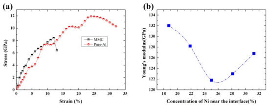 (a) The computed strain-stress curves for AlCoCrFeNi HEA reinforced AMCs and pure aluminum, (b) Young’s modulus of AMCs against the Ni concentration in the interfacial regions.