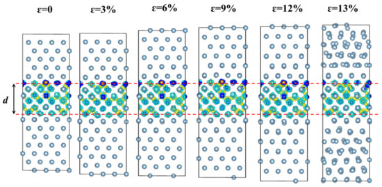 To further understand the fracture behavior of the HEA-reinforced AMCs, the atomic structures under different applied strains are shown in Figure 8, together with the differential charge density as calculated in Section 3.2.1. As shown in Figure 8, the thickness, d, of the HEA layers varies little under the applied strains, meaning that the Al layers mainly withstand the strain applied on the HEA-reinforced AMCs. It could be caused by the fact that the bonding strength among the HEA layers is much higher than that of Al layers. Interestingly, when the fracture occurs in HEA-reinforced AMCs under an applied strain of 13%, atoms in the Al layers are strongly distorted due to the dislocation multiplications, while those Al atoms close to the interface distort little. Such interfacial behavior further indicates the bonding strength between the HEA layer and the Al layer is also stronger than that among the Al layers, and the formation of AlCoCrFeNi HEA reinforced AMCs is highly feasible.