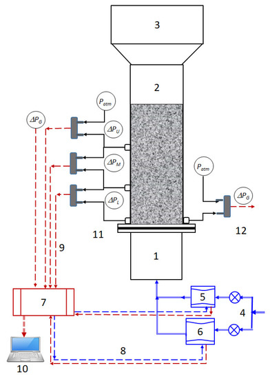 Experimental setup schematic. (1) Wind-box; (2) Test section; (3) Disengagement section; (4) Compressed air supply; (5) Mass flow controller (low flow); (6) Mass flow controller (high flow); (7) Data acquisition system (DAQ); (8) Analog output (AO) signals (blue broken lines) (9) Analog input (AI) signals (red broken lines); (10) Laptop with LabVIEW software; (11) Pressure taps for upper (), middle ( ), and lower ( ) pressure drops; (12) Pressure taps for global pressure drop ( ).