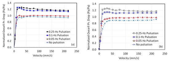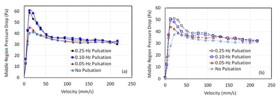 During the square-wave pulsed flow, the flow stoppage initiated the collapse, thereby causing a simultaneous decline in the pressure drop as well. However, for the evaluation of the average pressure drop, the pressure drop magnitudes for the fully developed were considered [24]. The variation in the local pressure drop in the upper region of the fluidized bed with the velocity is shown in Figure 4 for various pulsed flows. The case of conventional fluidization with no pulsation is also depicted in the figure for the sake of comparison. The 0.25 Hz and 0.1 Hz cases show close agreement with much greater pressure drop as compared to 0.05 Hz, which was still slightly higher than the conventional fluidized bed. This behavior is seen for both when the flow was gradually increased (Figure 4a) followed by a gradual decrease (Figure 4b). The steady increase in the pressure drop with the velocity occurs due to the bed expansion, which causes a greater input of bed solids in the upper region. A higher pressure drop indicates a greater expansion of the fluidized bed.