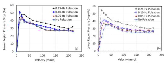 The pressure drop variation with the velocity in the lower region of the pulsed bed is shown in Figure 6 for both fluidization (Figure 6a) and defluidization (Figure 6b) cycles. The highest frequency pulsed flow in this case differs from all other cases especially during the gradual velocity decrease cycle of the experimental run (Figure 6b). This is caused by the partial collapse of the pulsed bed where the frequent collapse events cause a greater compaction, thus leading to higher frictional losses in the lower region.