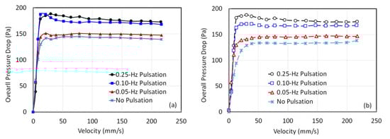 Next, in Figure 7, we consider the overall total pressure drop across the fluidized bed. The experimental data of the fluidization (Figure 7a) and defluidization (Figure 7b) cycles show the absence of hysteresis behavior. Moreover, the 0.25 and 0.10 Hz pulsed flows show good agreement with a significantly higher pressure drop than the corresponding 0.05 Hz case, which happens to be marginally higher than the one for the un-pulsed flow (conventional fluidization). A clear difference is seen in the defluidization cycle of the experiment. The 0.05 Hz flow pulsation clearly yields a slightly higher pressure drop than that for the un-pulsed flow. Likewise, 0.25 Hz pulsation causes a higher pressure drop than the one for 0.10 Hz. Note that the effective weight per unit area of the fluidized bed is approximately 149 Pa, whereas we often obtain pressure drop values as high as 185 Pa for the fully fluidized bed with the introduction of flow pulsations. This issue will be discussed in detail in Section 3.3.