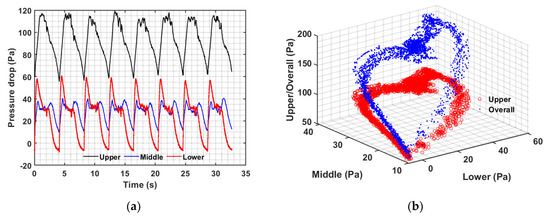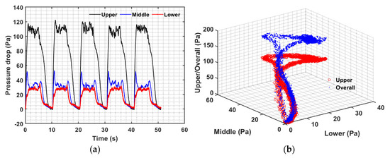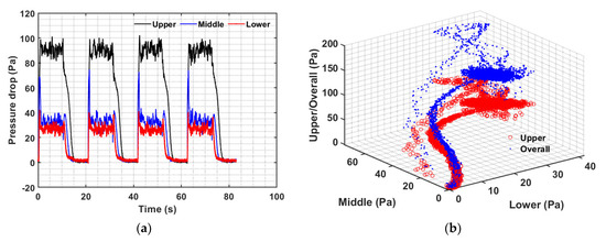 The dynamics in various bed regions were examined by utilizing the experimental data of the entire spectrum of several pulses at a fixed flow rate. First, let’s consider the case of 0.05 Hz in Figure 9 with 10 s of gas flow followed by another 10 seconds of pause at a velocity of 182 mm/s. There were four complete pulses with a total duration of over 80 seconds, with approximately 8000 pressure-transient data points for each of the three regions in addition to data points for the overall pressure drop transients. The results are shown in Figure 9a. At the beginning of the flow pulse, all regions immediately responded to the change in flow. The vigorous solid motion was captured by the disturbances in the pressure transients. Once the flow was stopped, the bed collapse started. As expected, the effect of the bed fall was felt first in the lower portion, followed by the middle region, and subsequently the upper part.