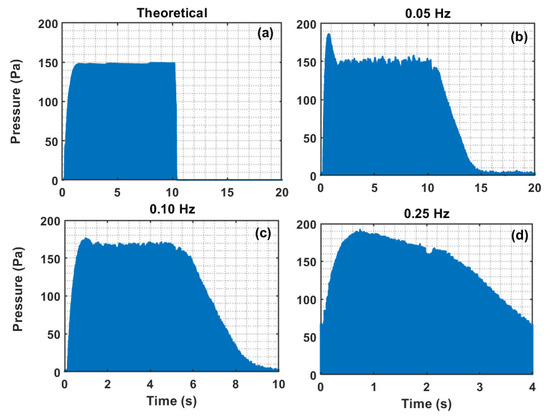 where is the overall pressure drop signal across the pulsed bed. Four different cases are depicted in Figure 12 for the estimation of the integral in Equation (3). Only one complete pulse is shown in the figure for each of the three cases, i.e., 0.25, 0.1, and 0.05-Hz, at 182 mm/s. However, the power was computed using all four pulses for 0.05 Hz, five pulses for 0.10 Hz, and eight pulses for 0.25 Hz for a fixed velocity to ensure precise evaluation of the expression in Equation (3). In addition, the power of the theoretical case was also computed by noting that the theoretical pressure drop is equal to the effective bed weight, which is shown for the case of 0.05 Hz pulsation in Figure 12a. The shaded area shown in the figure corresponds to of a single pulse. Therefore, the greater the shaded area, the higher the power or the energy dissipation per unit time. As the frequency increases, the shaded area also increases, thus clearly indicating a greater dissipation of energy.