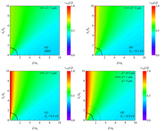 To extract the contribution of SPs and HPhPs to the enhancement of the Casimir force, the TM reflection coefficients as a function of imaginary frequency and wave vector component are presented in Figure 5. When comparing Figure 5a,b, it is clear that is enhanced at low frequencies when the hBN is covered by graphene, and as shown in Figure 5b–d, the enhancement area grows as the Fermi level increases. In Equation (7), the term acts as a truncated function. The arc of a circle for is plotted in Figure 5. The amplitude of the force can be represented by reflection coefficients inside the arc [23]. Clearly, the proportion of high reflection coefficients inside this arc grows as increases. Correspondingly, the Casimir force is getting larger for with increasing , as shown in Figure 3. Furthermore, the radius of a circular arc is inversely proportional to the separating distance d. In Figure 5d, we also plot the curves for and . Obviously, with increasing d, i.e., decreasing radius, the proportion of high reflection coefficients is increasing. As a result, the Casimir force tends to with expanding d, as illustrated in Figure 3.