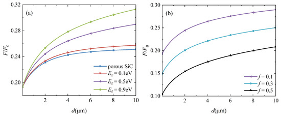 The Casimir force between two identical graphene-covered porous SiC bulks is also investigated in relation to the separating distance d. The filling factor is , and the forces for varying Fermi levels are presented in Figure 6a. The force between two porous SiC bulks is plotted for comparison purposes, as shown by the blue line in Figure 6a. Similar to the case of graphene-covered hBN, the Casimir force increases monotonically with increasing Fermi levels, particularly at large separating distances. These results are expected according to the above analysis because porous SiC is also an HM. Furthermore, when the Fermi level and separating distance are fixed, a more significant force can be obtained in the graphene-covered porous SiC configuration than in the graphene-covered hBN bulks, as shown in Figure 3. As shown in Figure 2b, both and are negative in the range to , indicating that porous SiC also excites electromagnetic modes other than HPhPs. These modes are all coupled and contribute to the Casimir force.