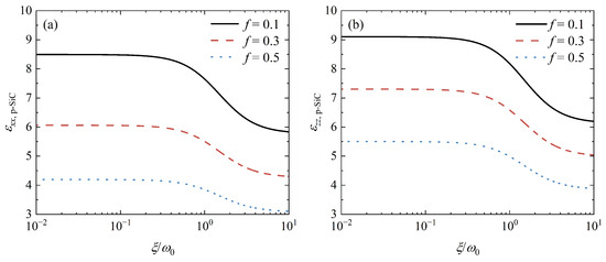 As an artificial HM, the permittivity of porous SiC can be modulated by the filling factor f. Therefore, f influences the coupling of SPs supported by graphene and HPhPs supported by porous SiC, which can be used to control the Casimir force. Figure 6b depicts the Casimir force as a function of the separating distance d for different filling factors. When f increases, the relative force for arbitrary separations decreases dramatically. This outcome is simple to comprehend. As f increases, so does the proportion of air holes. According to Equations (4) and (5), the electric properties of porous SiC should decrease as f increases. As a result, the Casimir force decreases as the contribution of these modes supported by porous SiC decreases. Figure 7 depicts the permittivity of porous SiC as a function of for different filling factors to demonstrate this explanation. As the filling factor f increases, for arbitrary , both and decrease, confirming our prediction. Furthermore, when , all curves in Figure 7 are almost flat, but sloping when . As previously stated, the force at a small separation distance is primarily derived from electromagnetic modes in the high-frequency region, whereas modes in the low-frequency region mainly contribute to the force at a large separation distance [22]. As shown in Figure 6b, slopes of relative forces at a small separation distance are large, while slopes at a large separation distance are small.