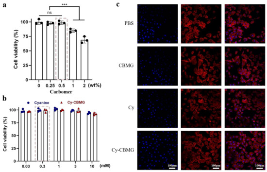 Figure 2. Biocompatibility assessment for Cy, CBMG and Cy-CBMG. (a) Cell viability after incubated at various concentrations of carbomer (0.25, 0.5, 1, 2 wt%). (b) Cell viability after incubated with various concentrations of Cy and Cy-CBMG (0.03, 0.3, 1, 3 mM). (c) Cytoskeleton staining of HUVECs co-incubated with PBS, CBMG (0.5 wt%), Cy (0.3 mM), and Cy-CBMG (0.3 mM). ns: no significance, p > 0.05; ***: a statistically significant difference between groups, p < 0.001.