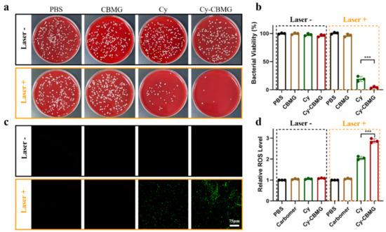 PBS, Cy (0.03, 0.3, 1, 3 mM), CBMG (0.5 wt%), and Cy-CBMG (0.03, 0.3, 1, 3 mM) were transferred into 1 mL MRSA or ESBL E. coli suspensions (1 × 106 CFUs/mL) and then irradiated with laser (600 nm, 100 mW/cm2) for 30 min. The control groups did not undergo laser irradiation. The antibacterial activity was assessed using the spread-plate method, ROS analysis, scanning electron microscope, and live/dead staining.