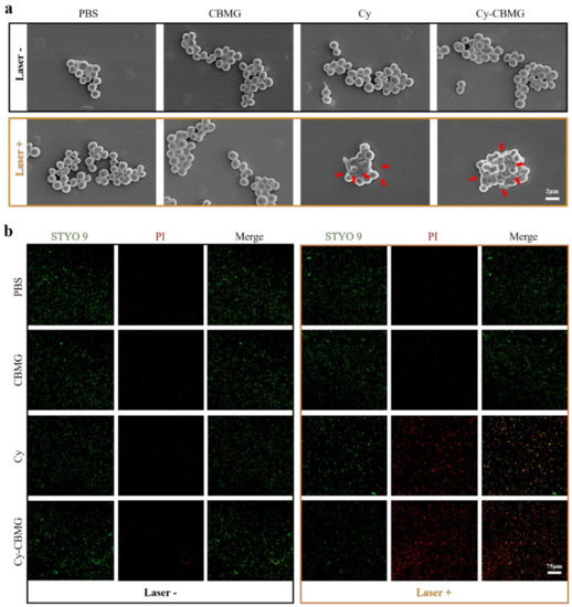In addition, the morphological changes of MRSA and ESBL E. coli were studied under SEM. Figure 4a and Figure S5 display the morphology of bacteria with or without laser irradiation. The normal MRSA and ESBL E.coli had smooth and intact cell walls. In Cy-CBMG with laser irradiation, collapsed and distorted cell membranes were commonly observed, as was further verified by bacterial live/dead staining. After treatments, live cells were stained by STYO-9 with green fluorescence, while the dead cells, which decreased membrane impenetrability, were labeled with red fluorescence by PI. As shown in Figure 4b, faint green fluorescence and apparent red signals were observed in photo-activated Cy-CBMG, indicated that Cy-CBMG under laser irradiation had produced excessive ROS to damage the integrity of bacterial membrane, which eventually led to cell death. Results demonstrated that Cy-CBMG had outstanding antibacterial efficacy and deserved further study in vivo.
