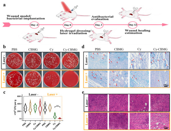 As a potential wound dressing material, the developed Cy-CBMG hydrogel was tested for wound healing efficacy (Figure 5a). Upon the limited penetration of laser irradiation [35,36], a superficial skin infection model of mice was established by implanting MRSA germs on a dorsal wound. While the skin has the capability of self-regeneration, which involves a series of biological processes of hemostasis, inflammation, proliferation, and remodeling, the presence of bacteria can ignite persistent inflammation, which may damage the healing cascade and eventually lead to delayed tissue regeneration and wound healing [37,38]. Hence, wound disinfection is an essential approach to reboot the repairing system of the skin [39].