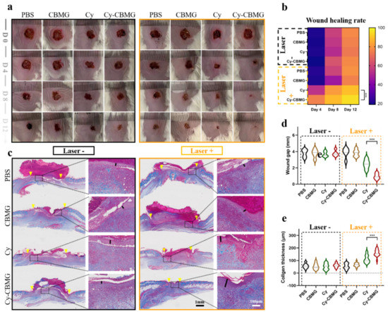 Within 12 days, the wound was photographed at days 0, 4, 8, and 12. Over time, the wound area in mice tended to reduce in all groups. At day 4, the wound healing rate was 74.8% in the Cy-CBMG/laser group, which was significantly higher than in the Cy + laser irradiation group (53.8%). For other groups, the wound healing rate was lower than 30% at day 4 (Figure 6a,b). In addition to effective wound disinfection function by PDT, Cy-CBMG shielded wounds against bacterial re-invasion and maintained a moist microenvironment, which are beneficial for wound healing [42].