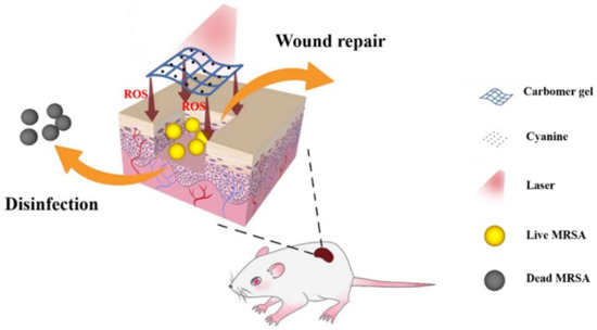 PDT is a photochemistry-based treatment that combines photosensitizers, light, and oxygen. When the photosensitizer is activated by the light of a specific wavelength, local reactive oxygen species (ROS) are elevated to destroy the proteins, nucleic acids, and membranes of the cells, and eventually leads to cell death [8,9,10]. Clinically, PDT is used to treat a variety of diseases, including cancer, acne, psoriasis, and bacterial infections [8,11,12]. In animal and pre-clinic studies, there are numerus studies that applied PDT to treat infected wounds, which are a common occurrence in clinics [9,11]. In fact, bacterial infection in skin wound causes unexpected tissue damage and triggers severe inflammatory reactions, which eventually delays wound repair. Although various photosensitizers have been developed to prevent wound infection, the biocompatibility remains a clinical concern. For example, some photosensitizers, such as silica, gold, and iron oxide nanoparticles, are not biodegradable and may cause harm to lives [13,14].