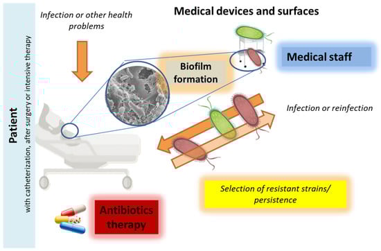 The simplified cycle of nosocomial bacterial infection and the crucial role of biofilms in the spreading and resistance process. The biofilms formed may be related to bacterial resistance depending on environmental conditions, in particular cleaning procedures, disinfection, and antibacterial agents. Increased persistence and avoidance of treatment with antibacterial substances lead to the preservation of bacteria on medical devices, surfaces, and tissues. This increases the risk of reinfection, contributes to the selection of resistant strains and their spread in the hospitals.