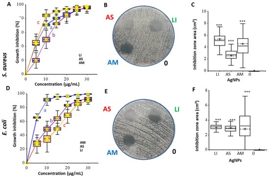 Effect of AgNPs prepared using extracts from L. indica (LI), A. scholaris (AS), and A. multifolium (AM) in liquid medium (A,D), in agar diffusion test for different (50, 25, 12.5, 6.25 µg/mL) concentrations (B,E) S. aureus and E. coli cells. Control in the diffusion test was marked as 0. (C,F) represent summary data from all performed integrals of inhibition surfaces. All measurements and experiments were performed in no less than five replicates. For further details, see the chapter Material and Methods.