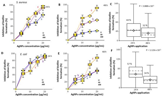 The antibiofilm potential of AgNPs prepared using extracts from L. indica (LI), A. scholaris (AS), and A. multifolium (AM) on S. aureus (A–C) and E. coli (D–F) cells after exposure 24 and 48 h. The effect was calculated relative to the control without nanoparticles (0%); calculations also considered the intrinsic density of nanoparticles adsorbed on the surface of the plate wells. A boxplot reflects the cumulative effect of all concentrations of one type of particle in an experiment. LB medium, incubation at 37 °C, staining with crystal violet. All measurements were performed in no less than five replicates. For further details, see the chapter Materials and Methods.