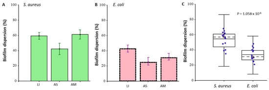 The ability of AgNPs prepared using extracts from L. indica (LI), A. scholaris (AS), and A. multifolium (AM) to disperse 48 h biofilms of S. aureus (A) and E. coli (B). Biofilm formation from all AgNPs analyzes in SA and EC (C). Absolute values for S. aureus OD600 = 0.40 ± 0.05 for E. coli OD600 = 0.70 ± 0.05. The effect was calculated relative to the negative control sample without nanoparticles (0%); calculations also considered the intrinsic density of nanoparticles adsorbed on the surface of the plate wells. LB medium, incubation at 37 °C. The staining was performed with crystal violet. All measurements were performed in no less than five replicates. For further details, see the section of Material and Methods.
