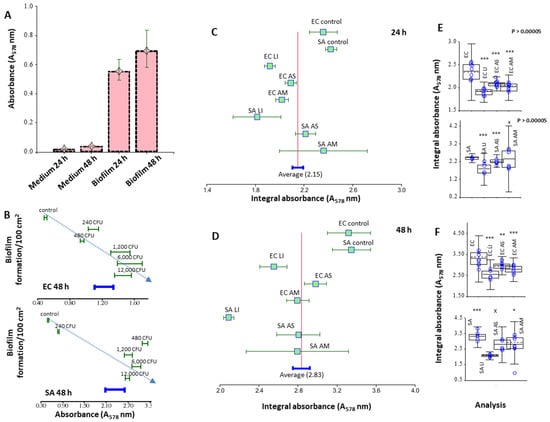 Spectrophotometric study of biofilm formation—Pyrogallol red method. Comparison of protein content in biofilm in 24 and 48 h against bacterial medium for E. coli (A). There are significant differences between protein content in media and biofilms and between 24 h and 48 h-biofilm. (B) Dependence of biofilm formation on CFU after 48 h. The protein content is increasing with a growing number of CFU. (C) Forest plot comparing the effect of using 20 μg/mL of AgNPs from L. indica (LI), A. scholaris (AS), and A. multifolium (AM) on biofilms of S. aureus (SA) and E. coli (EC) against non-treated biofilms in 24 h and (D) 48 h. (E) Boxplots comparing the overall area of non-treated biofilms and biofilms treated with 20 μg/mL AgNPs from LI, AS, and AM during 24 h and (F) 48 h.