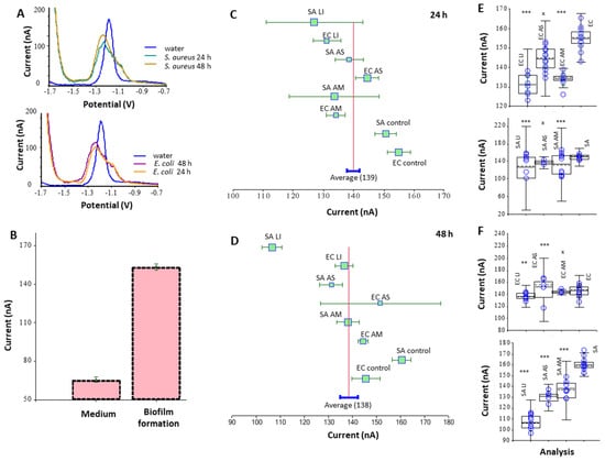 Electrochemical study of biofilm formation—the Brdicka reaction. A range of measurement: −0.7 V to −1.95 V; voltage amplitude: −25 mV; time amplitude: 0.8 s; measurement time: 10 ms; pulse time: 30 ms; voltage step: 4 mV; sweep rate: 5 mV/s; sample volume: 10 μL; Brdicka buffer volume: 3 mL. Dependence of electrical current (nA) on potential (V). Mutual curve comparison between water and biofilm formation in the first and the second day for E. coli (EC) and S. aureus (SA) (A). Comparison between absolute area signals among medium and biofilm (B). Forest plot comparing effect of using 20 μg/mL of AgNPs from L. indica (LI), A. scholaris (AS), and A. multifolium (AM) on biofilms of S. aureus and E. coli against non-treated biofilms in 24 h (C) and 48 h (D). Box-plots comparing the overall area of non-treated biofilms and biofilms treated with 20 μg/mL AgNPs from LI, AS, and AM during 24 h (E) and 48 h (F).