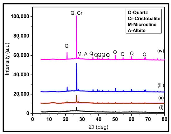 It is worth noting that the intense peak at 2θ = 26 is characteristic of Quartz silica (JCP phase from ICDD: 01-083-0539) [20]. Furthermore, the crystalline silica is slightly more intense in (iv) than in (ii) [22]. The synthesized silica presented other peaks characteristic of cristobalite, which forms at higher temperatures indicating varied phases of silica in the sample [20]. Additionally, microcline (KAlSi3O8) and albite (NaAlSi3O8) minerals were also identified for the as-prepared silica shown in the diffraction patterns of low and weak peaks [21,22,23]. As mentioned earlier, the diffraction peaks at 2= 20, 26, 36, 39, 50, and 59 show that silica is highly crystalline mostly in a quartz form [24]. The average diameter sizes were determined to be approximately 26 nm and 29 nm using Scherrer’s formula for silica acid-leached with CA and L-Cys, respectively. The crystallite size was estimated by Scherrer’s formula as shown in Equation (5) below: