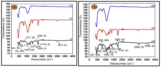 Despite that, the silica in Figure 2b (vi), showed a highly narrow and pronounced band at around 1060.76 cm−1 which is characteristic of crystalline silica, confirming the results obtained from XRD diffractogram(s). Additionally, the band at 3014.44 cm−1 corresponded to C–H stretch in (a) i and ii, respectively, whereas in (b) iv and v, the C–H band is at 2996.33 cm−1. The weak absorption band for hydroxyl group (OH) exhibited weak is observed for treated bagasse with L-Cys in (b) iv, v at around 3445.23 cm−1 [26,27,28].
