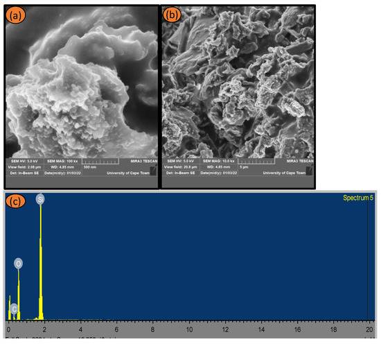 Figure 4a,b presents SEM micrographs of leached silica with L-cysteine hydrochloride monohydrate. The images revealed that silica nanoparticles are randomly distributed and clustered with a non-uniform and rough surface. The SEM-EDX of the as-prepared L-cys-TPAH silica is shown in Figure 4c, with the elemental composition predominantly silicon and oxygen with a very considerable amount of carbon present in the material.