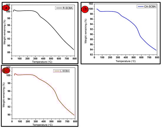 A thermogravimetric analysis (TGA) was conducted to investigate the thermal properties of the sugarcane bagasse ash from room temperature to 800 °C. This study essentially provided information on the pyrolysis/calcination temperatures and not the duration of the process. The thermogravimetric analysis in Figure 5 shows the thermal characteristics of (a) raw SCBA, (b) SCBA CA leached (c) SCBA L-cys leached respectively.