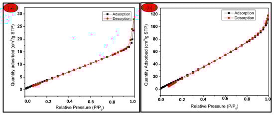 For the SCBA nano silica isotherm in Figure 6a, the hysteresis loop is observed at a range of 0.9 < P/P0 < 1.0, essentially associated with capillary condensation taking place in the mesopores. Furthermore, the loop at the high P/P0 side has been reported to be related to large pores. The little loop at Figure 6b observed at range of 0.2 < P/P0 < 0.4 is also due to the capillary condensation inside the mesoporous structure, however no loop at the higher P/P0 region is observed for this synthesized silica (SCBA nano L-cys Silica) [38,39,40].