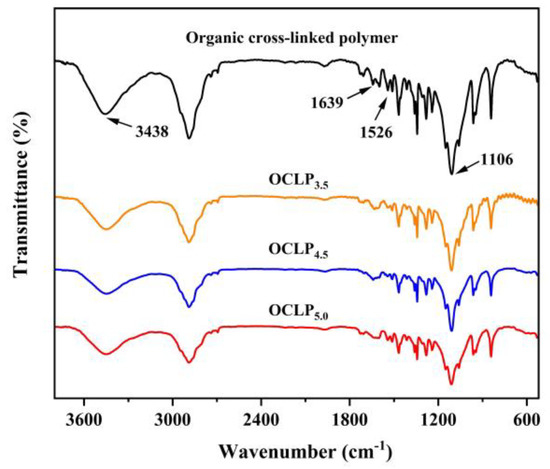 Figure 2 shows the FTIR spectra of the samples, which indicates that the characteristic absorption peaks for the OCLPs (OCLP3.5, OCLP4.5, and OCLP5.0) are similar. The peaks around 3438, 1639, 1526, and 1106 cm−1 correspond to the stretching vibration absorption peaks of the –OH, C=O, C–N, and C–O groups, respectively, which is consistent with the organic crosslinked polymer [27]. The above results illustrate that the OCLPs are a type of organic crosslinked polymer.