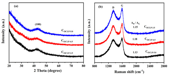The COCLPs obtained from the OCLPs were characterized using XRD and Raman spectroscopy. Figure 3a summarizes the XRD spectra of the COCLP-3.5, COCLP-4.5, and COCLP-5.0, showing that all the COCLPs exhibit obvious diffraction peaks at 43°, corresponding to the (100) crystal planes of the graphite structure. The results indicate that COCLP-3.5, COCLP-4.5, and COCLP-5.0 have amorphous graphite structures [28,29]. The diffraction peak intensity of the (100) lattice plane for COCLP-4.5 is the weakest, demonstrating that COCLP-4.5 has the highest structural disorder [30]. Figure 3b shows that there are two characteristic peaks at 1343 and 1594 cm−1, corresponding to the D and G peaks of graphite, respectively. The ratio of the areas of the D peak to the G peak (AD/AG) reflects the order degree of the COCLP structure [31]. The calculated ratios for COCLP-3.5, COCLP-4.5, and COCLP-5.0 are 1.15: 1, 1.18: 1, and 1.13: 1, respectively. This result also illustrates that COCLP-4.5 has more defects because the D peak represents a defect peak caused by the low symmetry or irregularity of the carbon material [32].