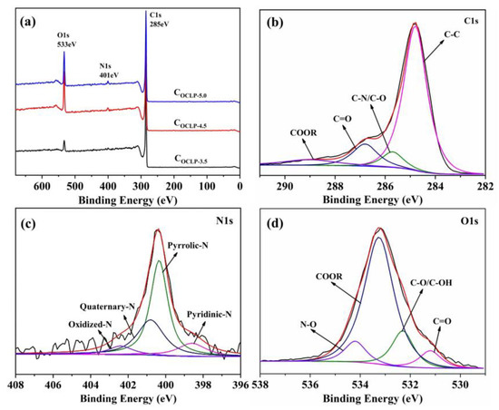 Further analysis of the surface electronic states and elemental compositions of the COCLPs samples was performed using XPS. Figure 7a shows that there are three peaks in the spectra of all the samples. The binding energies of the three peaks are 285, 400, and 532 eV, corresponding to C 1s, N 1s, and O 1s, respectively. The results also prove that carbon, nitrogen, and oxygen are present in the three samples. Table 2 lists the surface element contents of the three samples. These samples are mainly a carbon-based framework with oxygen and nitrogen. Fine analyses of the C 1s, N 1s, and O 1s spectra of COCLP-4.5 are performed using the peak differentiation fitting method, as shown in Figure 7b–d. The C 1s spectrum (Figure 7b) can be matched by four peaks at 284.8, 285.7, 286.8, and 289.0 eV, corresponding to the C–C, C–N, C–O, and COOR groups, respectively [38]. The N 1s spectrum, shown in Figure 7c, is deconvoluted into four peaks of 398.8, 400.3, 400.8, and 402.4 eV, corresponding to pyridinic-N (N-6) (11.70%), pyrrolic-N (N-5) (52.13%), quaternary-N (N–Q) (29.79%), and oxidized N (N–X) (6.38%), respectively. In particular, the pyridinic-N and pyrrolic-N contents reach 63.83%. A high content of N-6 and N-5 is beneficial for introducing pseudo-capacitance and providing electrochemically active sites and quaternary nitrogen (N–Q) can effectively improve the conductivity of COCLPs and promote electron transfer in the carbon matrix [35,39]. The deconvoluted O 1s peak displayed four peaks at 531.2, 532.3, 533.3, and 534.2 eV, representing the oxygen atoms in the C=O, C–O/C–OH, COOR, and N–O groups, respectively (shown in Figure 7d) [35,39]. According to a previous report [40], the oxygen groups are evenly distributed in the carbon framework, which can improve the interfacial tension between the carbon-based porous material and electrolyte to reduce the interfacial resistance.