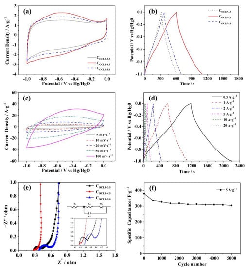 (a) CV curves of COCLPs at a scan rate of 5 mV·s−1; (b) GCD curves of COCLPs at a current density of 1 A·g−1; (c) CV curves of COCLP-4.5 at different scan rates; (d) GCD curves of COCLP-4.5 at different current densities; (e) Nyquist plots of the COCLPs; (f) stable cyclic performance of COCLP-4.5.