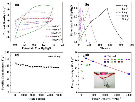 A symmetric supercapacitor was constructed using COCLP-4.5 to evaluate its practical application. Figure 10a shows the CV curves for the symmetric supercapacitor at different scan rates. The curves maintained a quasi-rectangular shape at a scan rate of 50 mV·s−1. A slight deformation indicates that the electrochemical behavior of a symmetric supercapacitor is a combination of the EDLC and pseudocapacitance. Figure 10b shows that the GCD curves for the symmetric supercapacitor increased with an increasing current density from 1 to 20 A·g−1. Based on Equation (2), the specific capacitance of COCLP-4.5 is 203 F·g−1 at 1 A·g−1 and its specific capacitance remains 150 F·g−1 at 10 A·g−1, demonstrating a good rate capability even at high current densities for the symmetric supercapacitor. Figure 10c shows the cycle stability curve at a current density of 10 A·g−1. It displays that the capacitance retention of the device is 84.0% after 5000 cycles, reflecting good cycling stability. Figure 10d indicates that the symmetric capacitor obtains an energy density of 18.04 Wh·kg−1 at a power density of 200.0 W·kg−1 based on Equations (3) and (4), significantly higher than those reported in recent years (13. [25], 10.83 [49], 13.60 [50], 7.00 [51], 13.86 [52], 10.60 [53], and 15.50 Wh·kg−1 [54]). Specifically, the symmetric supercapacitor device successfully powers up a light-emitting diode (the inset of Figure 10d). As shown in the video (see Supplementary Materials File S1), the light-emitting diode can last for a while. Obviously, the N/O-doped porous COCLPs are expected to be used in supercapacitors.