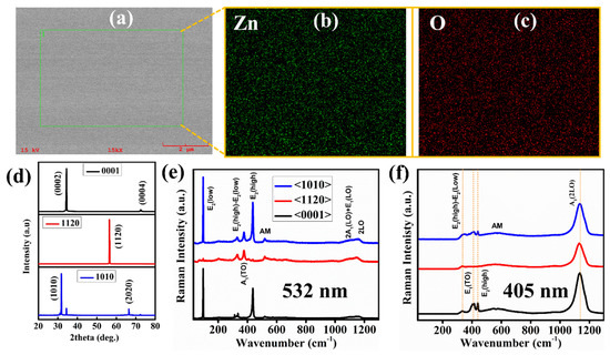 (a–c) Field-emission electron microscopy (FE-SEM) and energy dispersive spectroscopy (EDS) image of <0001> single crystal (d) XRD micrographs of all three ZnO single crystals <0001>, <1120> and <1010>. The Raman spectra of ZnO single crystals were measured with (e) an excitation wavelength of 532 nm and (f) 405 nm.
