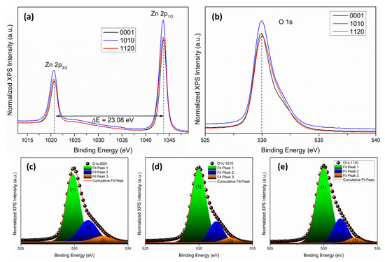 XPS core-level spectra of (a) Zn 2p and (b) O 1 s. The black dashed line indicates the peak position, and the horizontal double-head arrow represents the spin-orbit splitting (ΔE = 23.08 eV). Deconvoluted features of the O 1 s peak for (c) <0001>, (d) <1010>, and (e) <1120> orientation. Black spheres represent the experimental values, and the continuous red line indicates fitted results using the Gaussian fitting function.