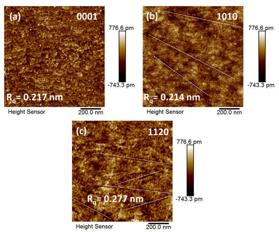 To deeply investigate the surface morphology and roughness of ZnO single crystals, atomic force microscopic (AFM) analysis in tapping mode has been performed, as shown in Figure 4a–c. The 2D micrographs indicate that surface of all three single crystals is relatively smooth with a surface roughness ranging from 0.214 nm to 0.277 nm and with a height (Z) sensor noise level or error of 0.035 nm, while a few cracks (white dashed lines) occur at the surface of <1010> and <1120> non-polar orientation which could be formed after synthesis and can be neglected. These results indicate that the morphology-related effects (grain size and shape) are not dominant in modulating the optoelectronic properties of ZnO single crystals in the present situation. Moreover, it is well-known that the shape and size of grain have an insignificant dependence on the polarity of a single crystal, if there is no substantial doping or post-treatment effect taken place. In contrast, the preparation route, post-annealing treatment, and doping can tailor the shape and size of grain and consequently modulate the surface roughness [32,33].