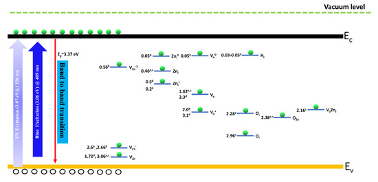 - Xu, P.S.; Sun, Y.M.; Shi, C.S.; Xu, F.Q.; Pan, H.B. The electronic structure and spectral properties of ZnO and its defects. Nucl. Instrum. Methods Phys. Res. Sect. B: Beam Interact. Mater. At. 2003, 199, 286–290. [Google Scholar] [CrossRef]