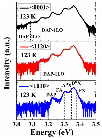 For better understanding of different emission centers, present in the NBE region, we have investigated the PL spectra of all three orientations at 123 K, as shown in Figure 7. All three single crystals show five dominant peaks at 3.374, 3.360, 3.346, 3.303, and 3.227 eV, representing the free exciton transition (FX), neutral donor-bound exciton (DoX) peak, neutral acceptor-bound exciton (AoX) peak, free electron to acceptor transition (FA) peak, and donor to acceptor pair transition (DAP) peak respectively. However, the <0001> orientation contains two additional peaks at 3.154 eV and 3.083 eV, which are recognized as the first-order longitudinal optical phonon replica of DAP transition DAP-1LO and DAP-2LO respectively. Conversely, the <1120> spectra only contain the DAP-1LO peak. The energy separation between these LO phonon replicas was found to be (hωLO = 70–73 meV), consistent with previous reports [47,48]. Semiconductor such as ZnO is well-known for its highly polar nature, making it significant for exciton-phonon coupling. However, the bound excitons are supposed to be the extrinsic transitions that originate from dopants or defects and create discrete energy states for the charge carriers in the bandgap region. In the present case, we used pure ZnO single crystals without any extrinsic dopant, meaning that the transitions from the bound excitons result from intrinsic defects. Based on previous theoretical predictions, these defects could be either Vo or Zni [49,50,51].