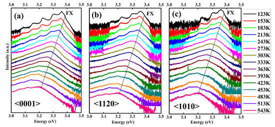 Figure 8a–c represents the temperature-dependent photoluminescence spectra from cryogenic temperature (123 K) to slight high temperature (543 K) for orientation <0001>, <1120>, and <1010> respectively in the NBE region (3.0–3.5 eV). The PL spectra contain several emission centers, the position and intensity of which varies with the temperature. The neutral donor-bound exciton peak (DoX) dominates at low temperatures in all three orientations. However, the FX transition becomes more prominent as the temperature increases due to small localization energy [52]. Additionally, the DAP emission shows a redshift with an increase in the temperature. The energy of a photon resulting from the radiative recombination of a DAP transition is given by the following relation,