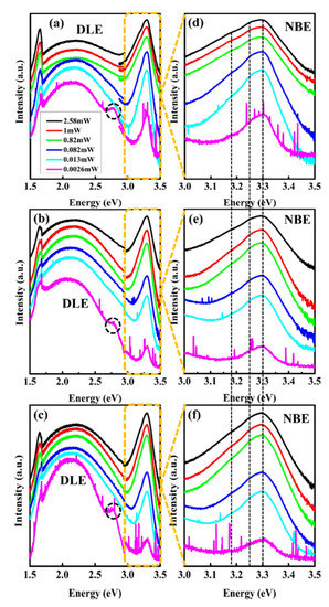 Figure 10a–c exhibits the excitation power-dependent photoluminescence spectra of ZnO single crystals. We have used the low excitation power of 2.6 μW to the highest power of 2.58 mW. It has been noted that the highest photoluminescence in NBE region has been achieved with all orientations using 2.58 mW. As the excitation power decreases, the NBE peaks intensity also decreases whereas the deep level emission dominates at low excitation power, which indicates that the NBE peak intensity has a directly proportional relationship with the excitation power (the relationship of calculated peak position, peak intensity, FWHM, and the ratio of NBE/DLE as a function of excitation power has been elucidated in the Figure S2 in the Supplementary Materials), this is very unpretentious, as the excitation power provides the specific energy to excite the charge carriers present in the valence band. Every electron excited by the incident photon must absorb that specific energy (~equal to the bandgap of that semiconductor material) before transfer to the conduction band. If the excitation power is low, the incident photon will not transfer much energy required to excite the electrons to the conduction band, then there will be no band-to-band transition; however emission from low energy levels or defect sites still has the possibility. Therefore, the emission from DLE dominates at lower excitation power as shown in Figure 10a–c. Similarly, if we use the excitation power that has energy greater than the bandgap energy of that material, in this case, band-to-band transition will be suppressed due to phonon bottleneck effect. As a result, phonon generation suppresses the electron-hole pair recombination and low NBE emission will be observed. Therefore, it is essential to use the excitation power which can transfer the photon energy equal to the bandgap of that material [62]. Moreover, it has been noted that the same excitation power used for different orientations of ZnO single crystal gives different intensities of luminescence bands present in the ZnO. It means that these luminescence centers are from the intrinsic defect states of ZnO, which does not influence external source. Furthermore, an emission band (at 2.78 eV) emerge in all orientations at low excitation power (0.0026 mW) which is not related to the ZnO sample. We suspect that this emission could be scattering from the system itself as there is no evidence of emission band in ZnO in the literature and it is also not present in other spectra while using higher excitation power. Therefore, we call it “unknown emission” band.