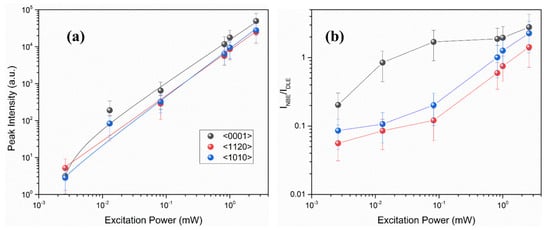 Here, η is the emission efficiency, and α represents the radiative recombination mechanism. For the excitation light having the energy higher than the bandgap energy of the target material, usually 1 < α < 2 for exciton-like transitions and α < 1 for free-to-bound and donor-to-acceptor like transitions [63,64]. The above relation is extensively used as a shred of evidence for finding the origin of the UV emission. In the present work, α has been observed to be , , and for <0001>, <1120>, and <1010> orientations, respectively, which makes it evident that exciton-like transitions are dominant in these samples. A distinct peak appears at 2.78 eV in all three orientations when we used the lowest excitation power (0.0026 mW), while it disappears at other excitation power conditions. This peak is not related to the ZnO samples but rather to the system. Moreover, we have also examined the emission intensity of the NBE peak and DLE peak as a function of excitation power, as shown in Figure 11b. It has been observed that <0001> contains a higher ratio at low excitation power. However, at higher excitation power the difference is not so significant. The trend suggests that the deep levels present in <1120> and <1010> orientations are intrinsic, possibly the oxygen vacancies (Vo). The density of these defects is lower in <0001> orientation, giving rise to a high NBE/DLE ratio even at low excitation power. In short, the current results elucidate that the development of defect-free homoepitaxial substrate for ZnO-based optoelectronic devices, the <0001> orientation will be much beneficial as the fraction of intrinsic oxygen-related defects is less. Furthermore, the free-excitonic transitions are dominant at higher temperatures in ZnO which can be helpful in the fabrication of ZnO-based UV diodes.