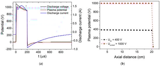Temporal evolutions of (a) discharge voltage, discharge current and plasma potential measured during PTVA with discharge voltage U = 1 kV, pulse duration τ = 200 µs and repetition frequency ν = 1 kV. (b) Axial distribution of peak plasma potential measured between Wehnelt cylinder and port substrate during DC-TVA (U = 400 V, I = 300 mA) and PTVA discharges.
