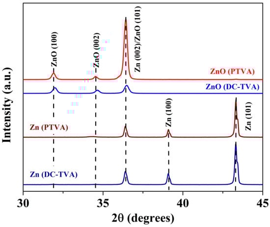 Figure 3 shows the X-ray-diffraction patterns for as-deposited Zn coatings and the thermal-annealed coating (ZnO) synthesized by DC-TVA and PTVA, respectively. The diffraction patterns of the as-deposited Zn coating deposited by DC-TVA confirm the presence of a Zn phase (according to PDF card no. 870713), with the main diffraction peaks positioned at 36.38°, 39.07° and 43.3°, which are assigned to the (002), (100) and (101) planes of pure Zn, respectively. The diffraction peaks of the as-deposited Zn coating deposited by PTVA are shifted to higher diffraction angles by 0.25°, indicating a tensile stress in the coatings, which could be caused by the grain-boundary shrinkage [73]. The diffraction peaks of Zn coating deposited by DC-TVA have the same intensity as the Zn coating deposited by PTVA, indicating roughly the same crystallinity degree of both coatings. The EDX measurements revealed that the Zn coatings deposited both in DC and pulsed TVA have (97 ± 1) at.% Zn and (3 ± 1) at.% O. The origin of oxygen in the as-deposited coatings can be assigned to residual oxygen from the discharge chamber, desorbed oxygen under intense ion bombardment, from the chamber wall, and to the natural oxidation process of Zn coatings as a result of their exposure to environmental conditions. The average grain size, estimated from the diffraction peaks’ width using Scherrer’s equation [74], is 73.4 nm and 84.2 nm in the case of the as-deposited Zn coating deposited by DC-TVA and PTVA, respectively.