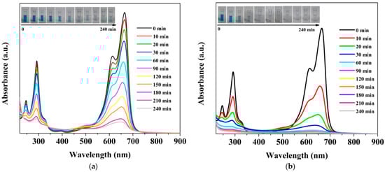 (a) UV-Vis-absorption spectra of MB dye as a function of irradiation time acquired in the presence of flower-like, nanostructured ZnO thin film, synthesized by DC-TVA (a) and PTVA (b), respectively. The inset photos show the colour change of dye solutions during irradiation.