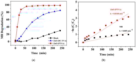 (a) The photocatalytic degradation plots of MB dye in absence or presence of nanostructured ZnO samples under UV light. (b) Linear kinetic-fitting curves with the degradation-rate constants for the UV-induced dissociation of MB by photocatalysts.