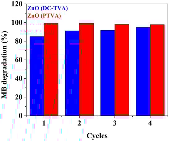 One important feature of the synthesized ZnO-based photocatalysts is their reusability: they can give almost the same performance over four consecutive cycles of 240 min under UV irradiation. As shown in Figure 7, a slight decay in the photodegradation efficiency of ZnO coating prepared by PTVA over the cycles (from 99% to 97.8%) has been observed, which might be due to the deactivation of the photocatalyst active sites by adsorbed degradation by-products or due to the conversion of zinc oxide (ZnO) in zinc peroxide (ZnO2). On contrary, the ZnO coating synthesized by DC-TVA revealed a slight improvement in its photodegradation performance (from 85% to 94.7%), probably due to the removal/decomposition of organic contaminants (hydrocarbons) adsorbed on the catalyst surface before photocatalytic degradation measurements. Organic compounds act as electron donors for photocatalytic reactions, and a part of the photo-generated holes are used for their decomposition [82].