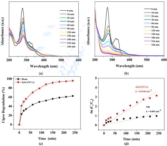 To further examine the capability of the ZnO coating synthesized by PTVA for the decontamination of water polluted with pharmaceutical compounds, the prepared photocatalyst has been tested for the degradation of ciprofloxacin, which is the most frequently detected fluoroquinolone antibiotic in wastewater plants and water resources around the world [83]. Considering the frequent detection of Cipro and its possible negative effects on aquatic organisms and human health, the European Commission has included the antibiotic on the updated Watch List under the Water Framework Directive [84]. It is well known that ciprofloxacin is prone to photochemical transformation by exposure to UV light. According to the literature, the photolysis of Cipro leads to the photosubstitution of fluorine and decarboxylation and the transformation of the piperazine ring [85]. The UV-Vis absorbance spectrum of Cipro at different irradiation times in the absence and presence of the nanostructured ZnO (PTVA) photocatalyst are shown in Figure 8a,b. The band and the humps located at 272 nm and 327 nm gradually decrease with an increase in irradiation time and are almost flattened after 240 min, for the flower-like, nanostructured ZnO (PTVA) coating. As can be seen in Figure 8c, the efficiency of photolysis was enhanced when UV irradiation was combined with the nanostructured ZnO coating. About 96% of the Cipro was degraded under 240 min of UV irradiation, which is 1.5 times larger than the value obtained in the absence of photocatalyst. Furthermore, after 240 min of UV irradiation, the estimated degradation rate of the Cipro over the ZnO sample was 0.0148 min−1, which is almost three times larger than the value of bare Cipro (Figure 8d). These results are superior compared to the values obtained for an earlier reported ZnO-based photosystem [86].