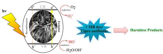 A possible photocatalytic degradation mechanism of MB and Cipro by the ZnO (PTVA) coating has also been proposed based on previous reports [27,29,39,86,87] and the aforementioned results (Figure 10). First, when nanostructured ZnO coatings are irradiated by UV light with energy hν equal to or higher than that of the band gap, electrons (e−) in the valence band (VB) may be excited to the conduction band (CB) with the simultaneous generation of holes (h+) in the VB. Then, these species (e−/h+) will react with water molecules and/or hydroxide anions (OH−) and oxygen to produce hydroxyl radicals (•OH) and superoxide radical anions (O2•−), respectively. Finally, these radicals may react with MB and Cipro molecules, breaking them into smaller and harmless fragments. The superior photocatalytic activity of flower-like, nanostructured ZnO synthesized by PTVA might be attributed to the synergetic effect between the coating morphology and crystalline order. A high crystalline quality and the high effective surface area of the ZnO nanorods allow for better transport and separation of the photo-excited electrons and holes on different crystal facets, leading to a low recombination rate and enhanced photocatalytic activity.