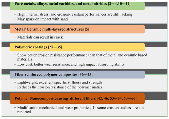 The literature includes research whose authors discovered that plastic polymer-based materials displayed characteristics such as elevated deformation, plasticity, malleability, and great flexibility. It was assumed that they had the ability to absorb and release impact energy very productively in a cyclic way during the deformation and restoration process. Therefore, the employment of polymer-based materials was attempted, and they effectively exhibited better wear performance in erosive situations than ceramic-based materials or metal. Hence, the routinely used metal and metal/ceramic-based anti-erosive protective composites were gradually replaced by polymer materials. Polymeric materials can be handled easily and have better processability, low cost, good erosion resistance, and a greater ability to absorb impacts. Detailed information about the types of polymers and their composites is summarized and presented in Section 3.